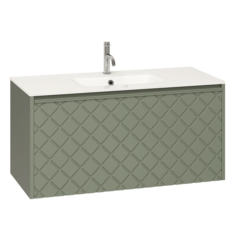 This 1000 mm Wall-Hung Vanity unit in sage green offers a tasteful modern look with color and finish flexibility. It comes with drawer functionality and sink housing, but as a wall-hung / semi-custom unit, it shows how color, finish, and modular layout are essential design levers.