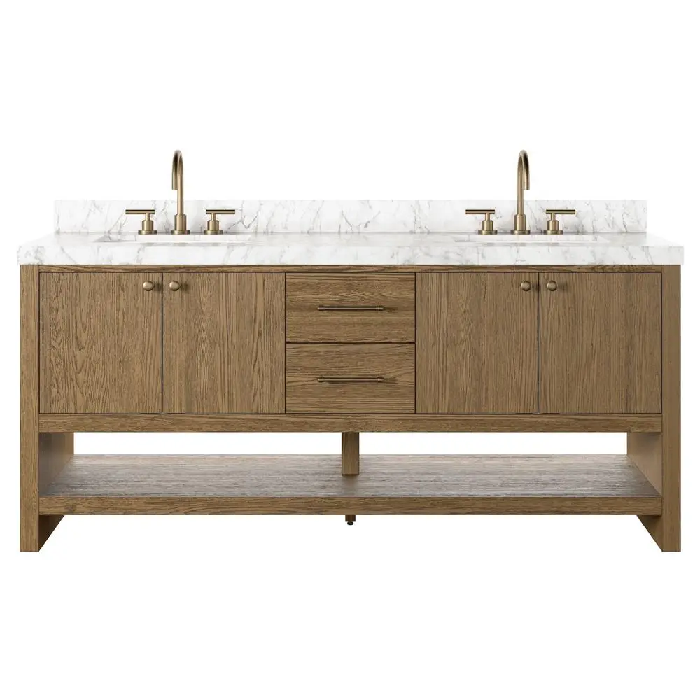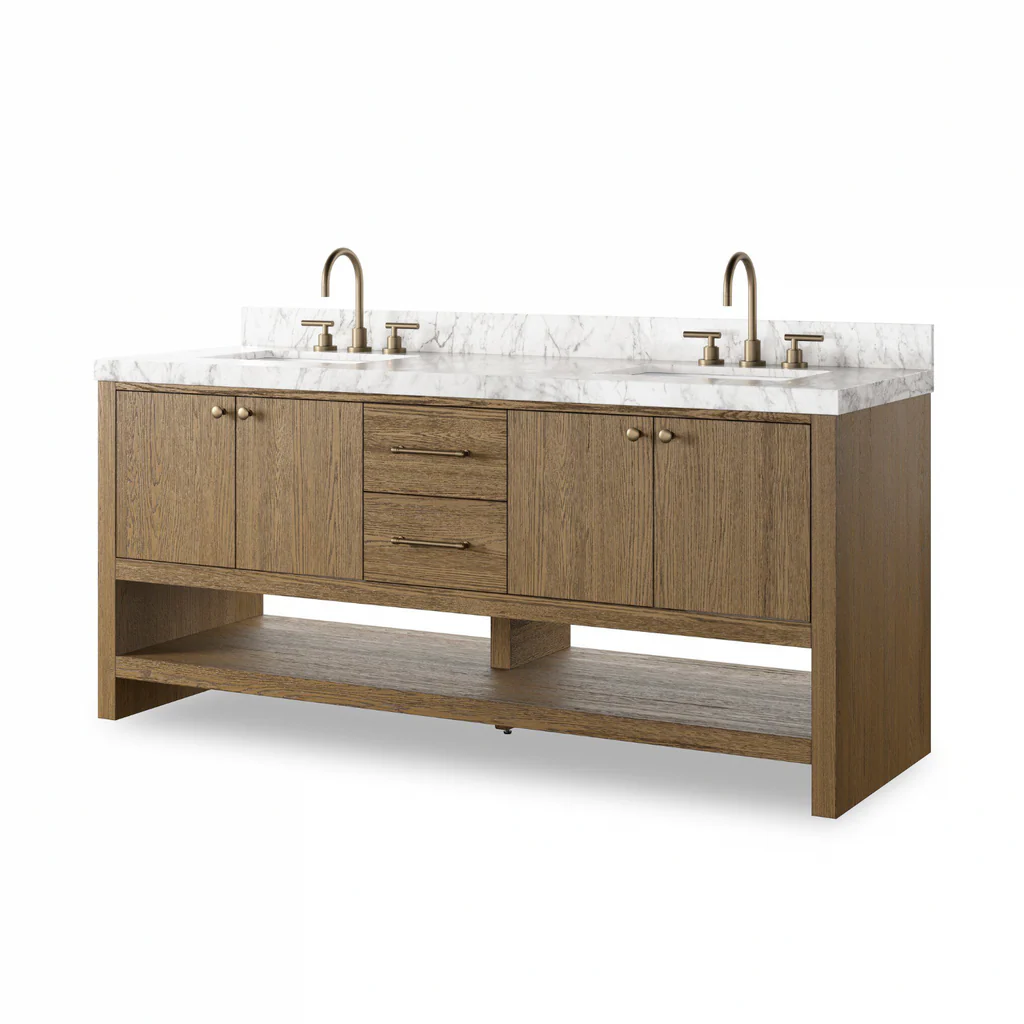 This Marble Vanity features Carrara marble with dual sinks, offering a classic luxury finish. Marble is often chosen in designer projects for its beauty and character. Even if this is a pre-fab type, it demonstrates how stone can be paired with vanity units for high-end aesthetics.