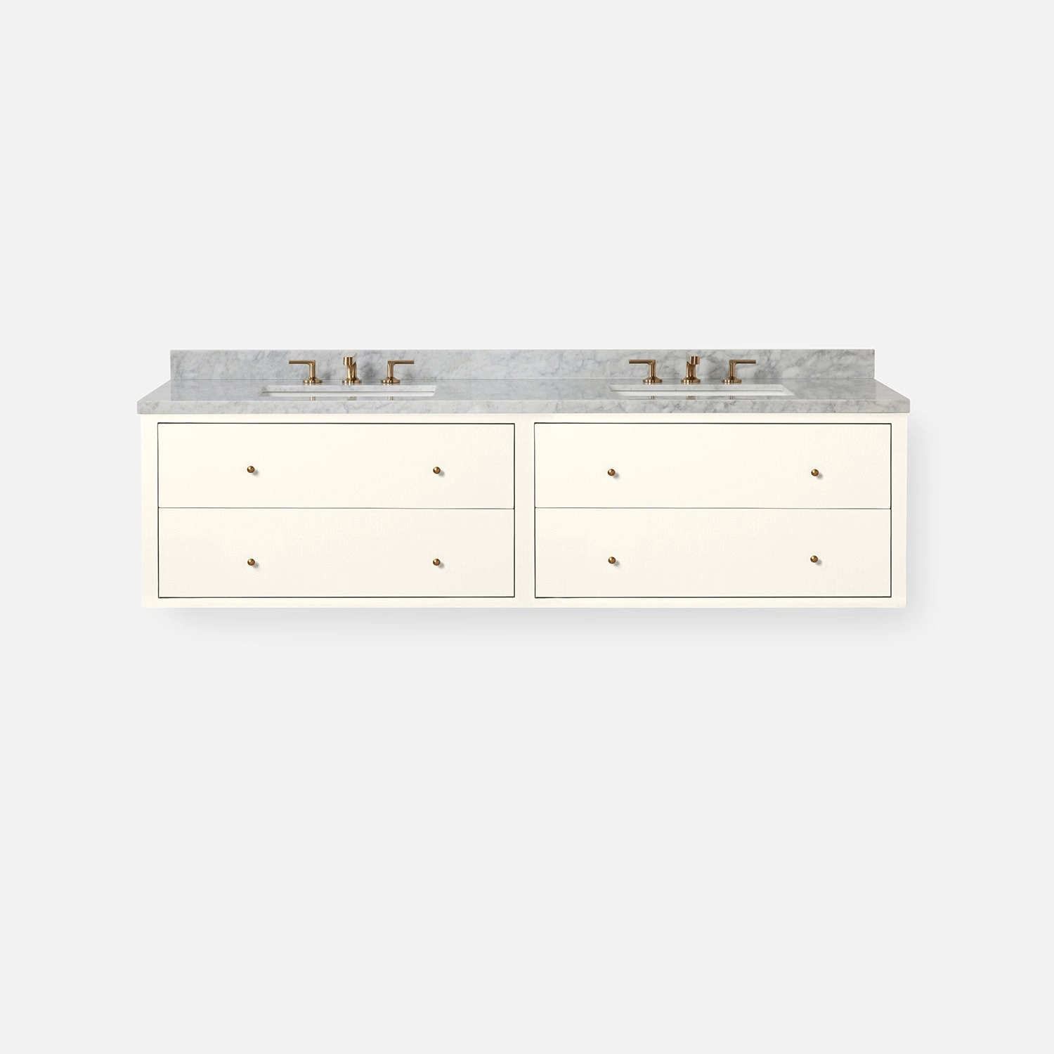 Use case: Use in a master bathroom to give each person their own sink with shared or divided storage, but cohesive design.