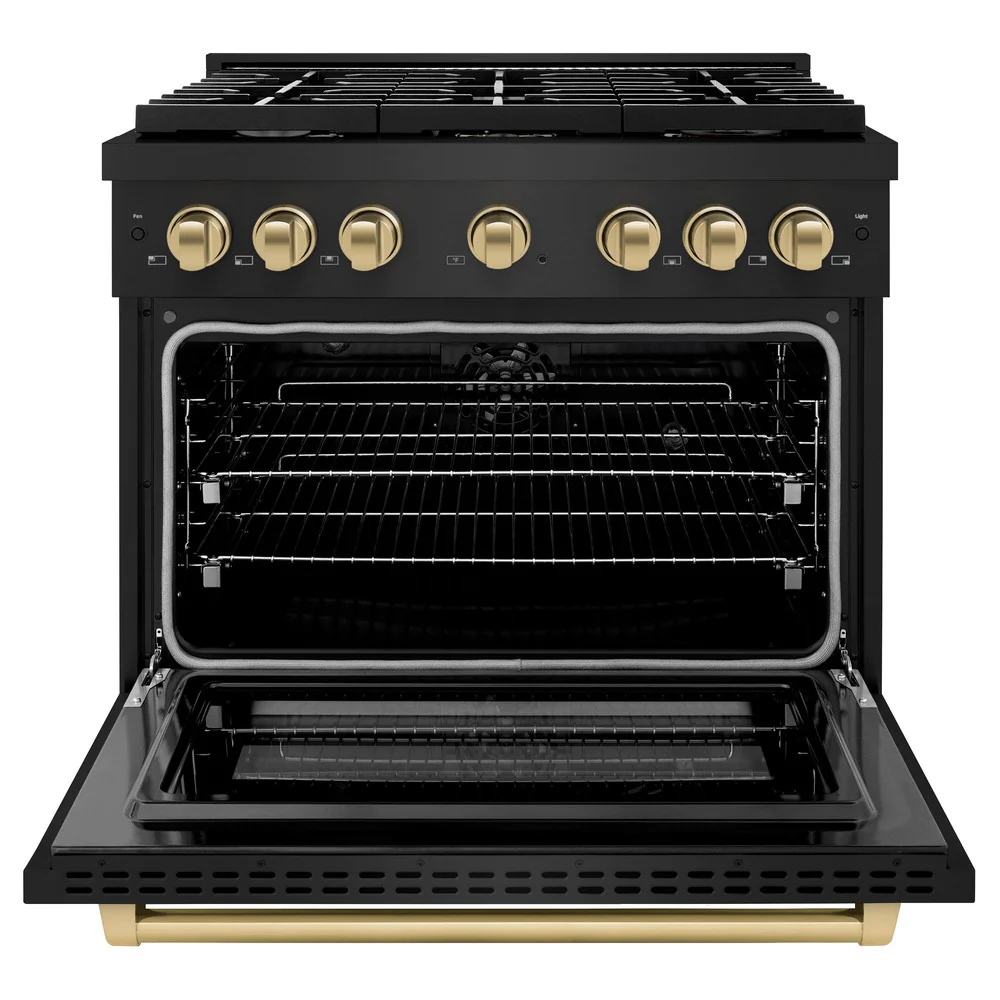 ZLINE Autograph 36″ Paramount Dual Fuel Range, this stunning dual fuel range features a gas cooktop with an electric oven for precision and performance. The solid brass burners and elegant finish create a professional centerpiece.